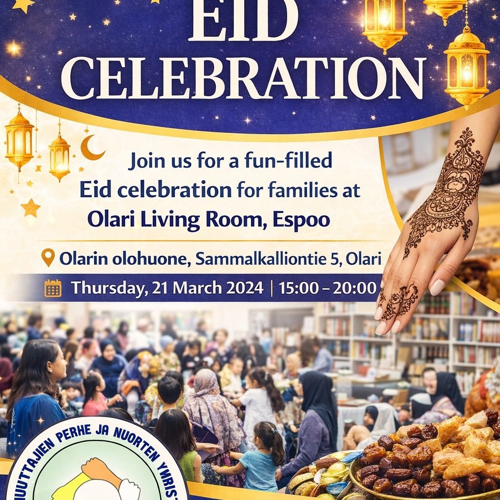 21 maaliskuuta järjestetty Eid-juhla Olarin Olohuoneella kokosi yhteen noin 100 osallistujaa – perheitä, lapsia ja yhteisön jäseniä eri puolilta Espoota. Tapahtuma tarjosi turvallisen ja avoimen kohtaamispaikan, jossa eri taustoista tulevat ihmiset pääsivät viettämään aikaa yhdessä, vahvistaen yhteisöllisyyttä ja keskinäistä ymmärrystä.